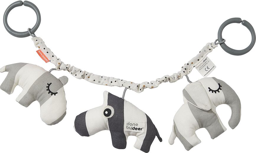 - Obesek za voziček blagovne znamke Done by deer je sestavljen iz naglavnega traku, oblečenega v blago, in 3 prijaznih živalic.