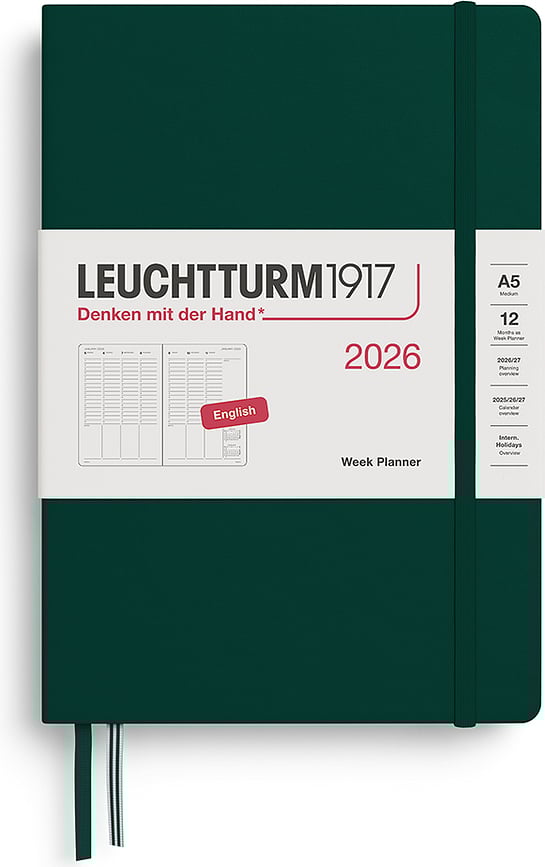 Razpoložljive različice:- Leuchtturm 1917 Tedenski planer s stolpci 2026 EN A5, trda vezava, gozdno zelena, Leuchtturm 1917 Tedenski planer s stolpci, 2026 EN, A5, oranžen, Leuchtturm 1917 Tedenski planer s stolpci 2026 EN, A5, črn, Leuchtturm 1917 Tedenski planer s stolpci, 2026 EN, A5, trda vezava, temno moder, Leuchtturm 1917 Tedenski planer s stolpci 2026 EN, A5, svetlo zelen, Leuchtturm 1917 Tedenski planer s stolpci, 2026 EN, A5, trda vezava, umazano roza