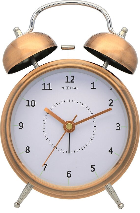 Klasična oblika in eleganten barvni zaključek sta zaščitna znaka tukaj predstavljene budilke Wake Up. Z lepim ohišjem bakrene barve budilka izžareva brezčasen vintage občutek, zahvaljujoč dvema tradicionalnima zvoncema, ki kronata ohišje, in nežnim, navzven obrnjenim nogicam. Bela številčnica čudovito poudarja bakrene kazalce in je popolno ozadje za črni indeks in arabske številke, ki označujejo ure. Poleg funkcije alarma je budilka opremljena tudi s funkcijo osvetlitve ozadja in tihim mehanizmom.