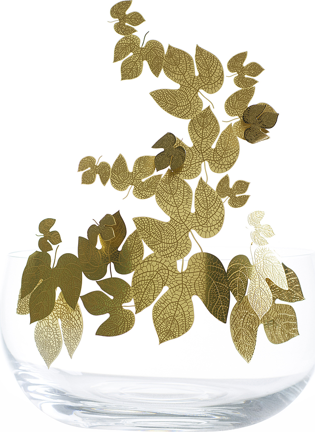 - Dekorativni medeninasti listi krasijo steklo in segajo čez robove posode, kar jo dela edinstveno dekoracijo.