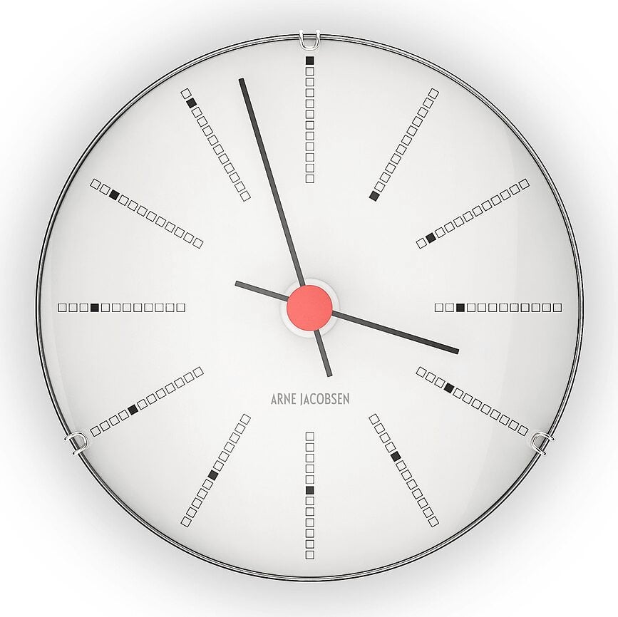 Stenska ura Bankers, ki jo predstavlja Arne Jacobsen, mednarodno priznani danski arhitekt in notranji oblikovalec, je zasnova, ki je bila sicer ustvarjena leta 1971 za industrijske namene, natančneje za Dansko narodno banko, a je postala predvsem ikona danskega 'domačega' oblikovanja. Videz ure, ki je trenutno na voljo v štirih velikostih, je zvest originalnim risbam oblikovalca in ga zaznamuje predvsem zanimiv urni indeks, rdeča pika na spoju kazalcev, bela številčnica, aluminijasto ohišje in mineralno steklo. Zahvaljujoč svoji zasnovi in načinu montaže se zdi, da ura lebdi v zraku, kar ji daje izjemno lahkotnost. Ura je opremljena z japonskim mehanizmom RHYTHM in deluje na 1,5V AA baterijo (baterija ni priložena).