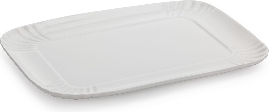 Pravokoten pladenj, ki je tukaj predstavljen, s svojimi zaobljenimi vogali in značilno ukrivljenim robom, presenetljivo spominja na krožnik za enkratno uporabo. Vendar pa njegova velikost in material, iz katerega je izdelan, razblinita vse iluzije glede njegovega namena. Ta elegantna, prefinjena posoda iz belega porcelana bo popolna kulisa za torte, piškote in vse vrste prigrizkov.