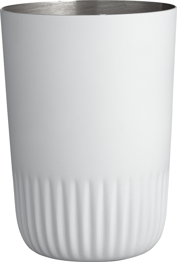 Iz nerjavečega jekla je izdelana skodelica za zobne ščetke iz linije Plissé znamke Södahl, ki je dekorativno nagubana pri dnu in ima enakomerno belo mat površino.